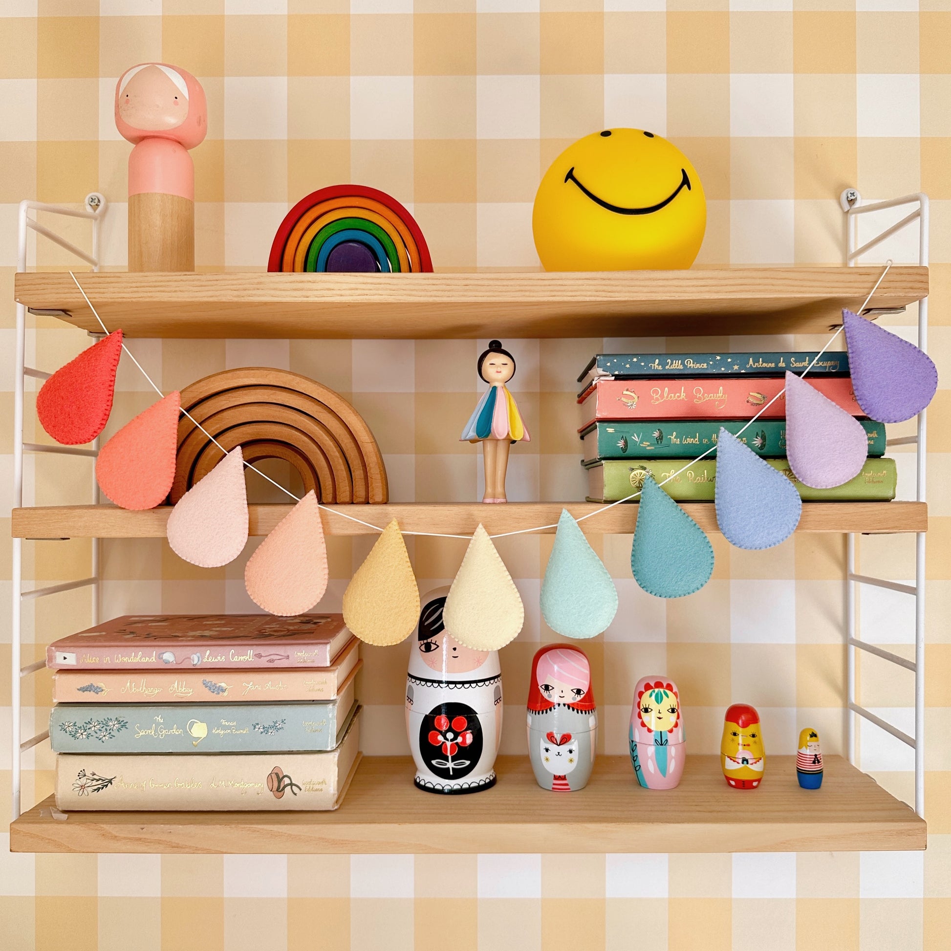 It's a little longer than some styles at around 70cm (10 drops) and it's a versatile garland that can easily be moved around the home and kids room, perfect under a shelf, or anywhere! The glitter option is longer still at around 80cm including end ties- select from the drop down menu.