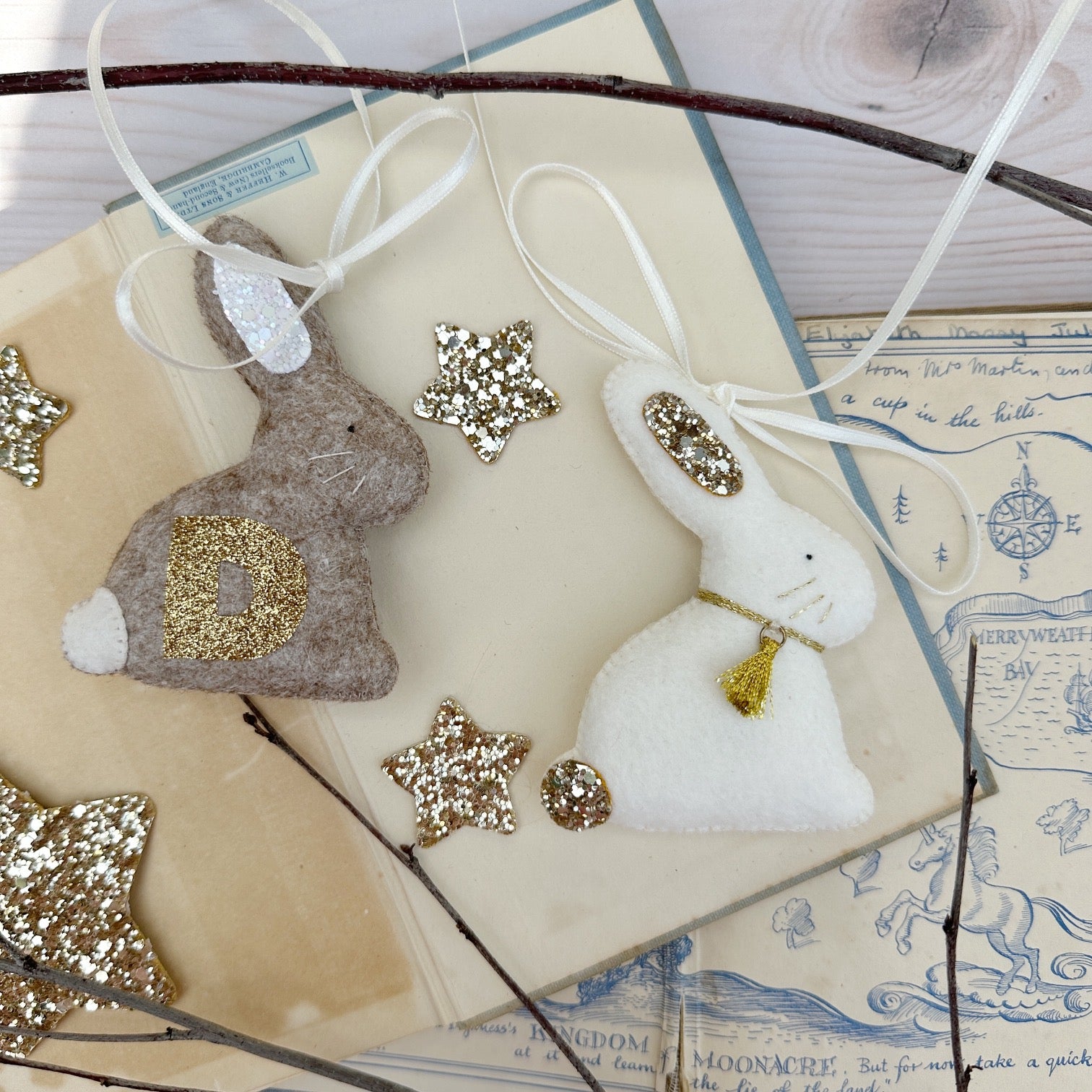 Choose from any colour felt ( at least 4 bonded layers of wool mix as standard) from my colour chart for your bunnies body, either Bridal White ribbon or natural twine tie and either felt, glitter or Liberty print fabric for the ear and tail detail. Each bunny is created completely by hand, stitched to order and embroidered with eye and whiskers (usually black eye and white whiskers but grey if stitching on white/off white felt, but please let me know if you'd prefer something else)