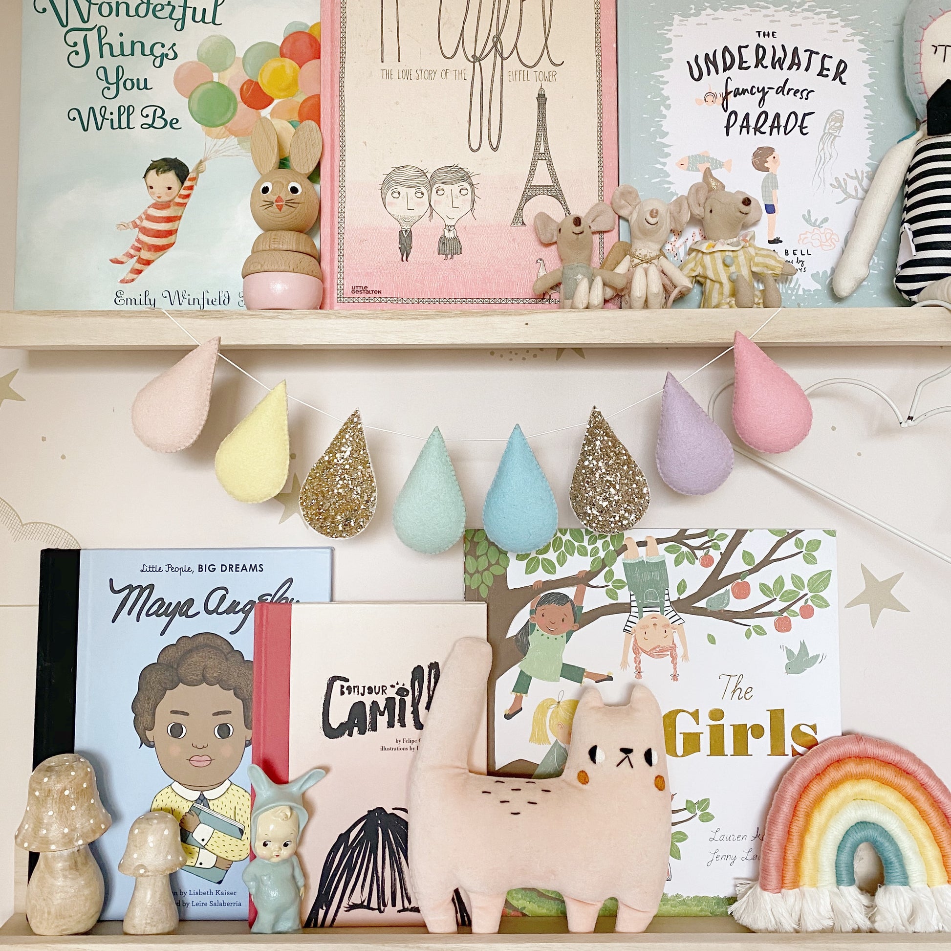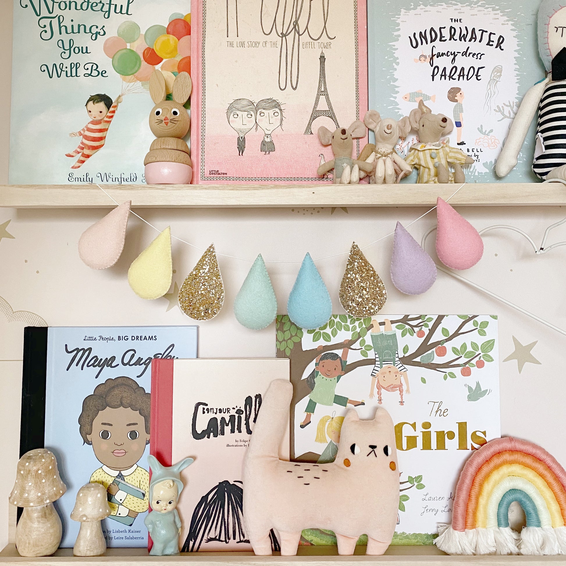 One of my bestsellers, this pastel rainbow raindrop garland is made from droplets in pastel rainbow hues in high quality wool mix felt, and two thick gold glitter drops.