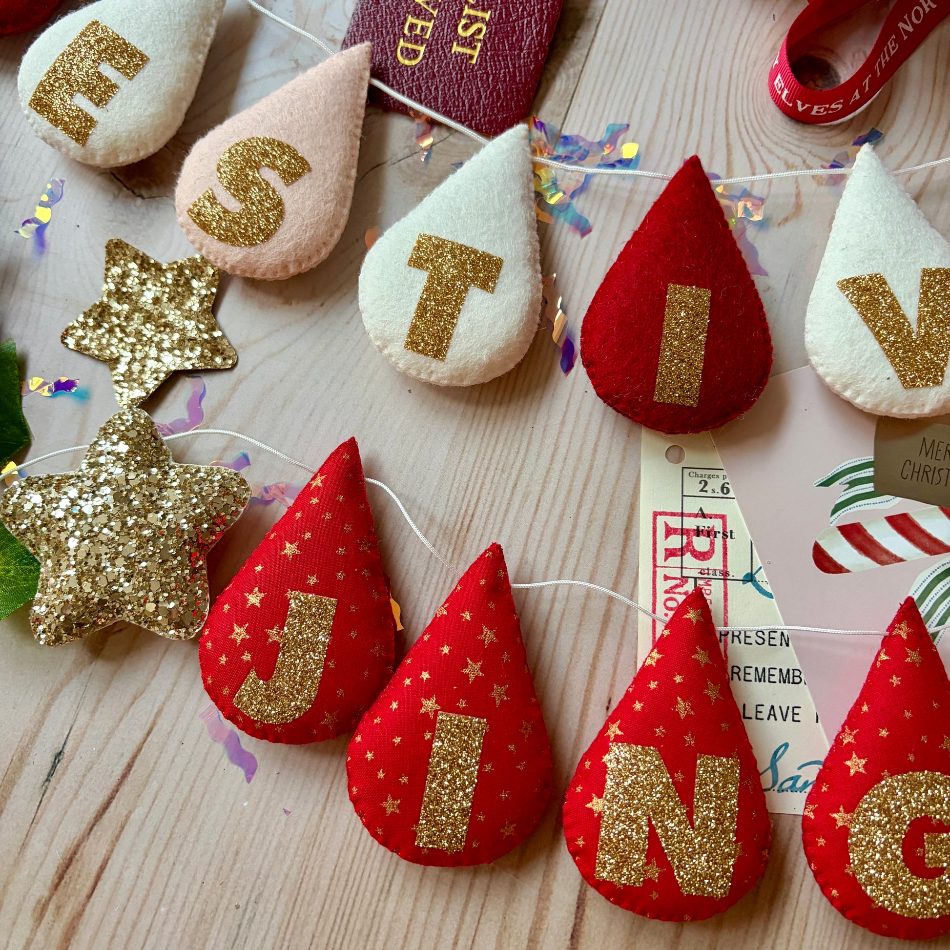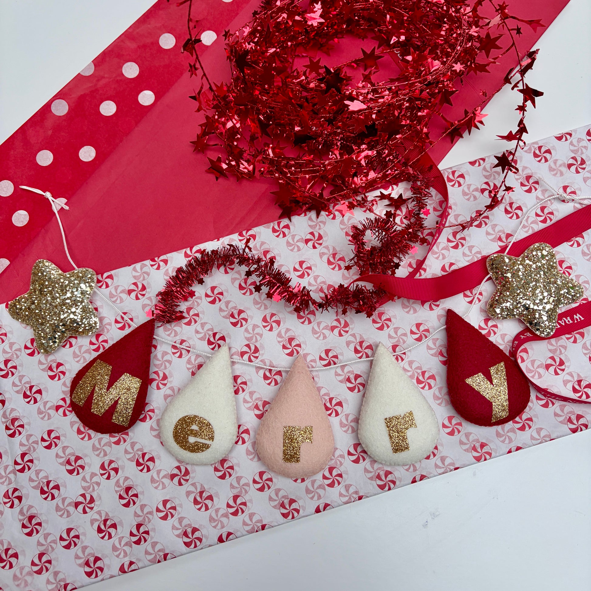 Gold fine glitter lettering (or black or silver fine glitter) in a word or name of your choice topped onto your your choice of colours. Add extra plain drops, or glitter drops to create your own bespoke droplet garland which I will create by hand for you.