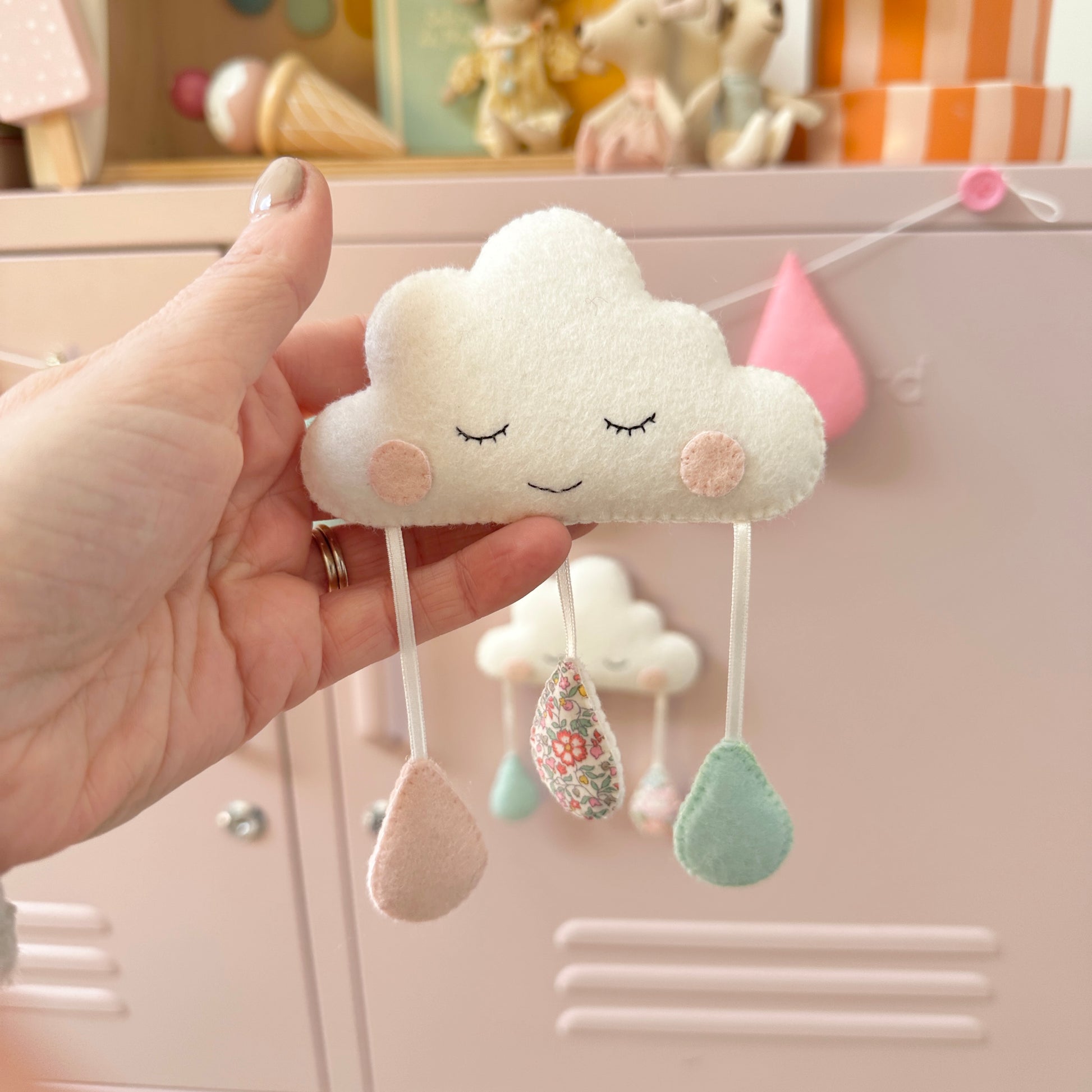 Single Cloud, or with 3 rain drops of your colour choice- cloud 11cm, drops 4cm long.