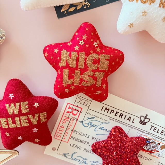 Small Star- no wording option, but can be sewn in felt colours of your choice or festive glitter shades- red glitter, gold or silver. 6.5cm across.