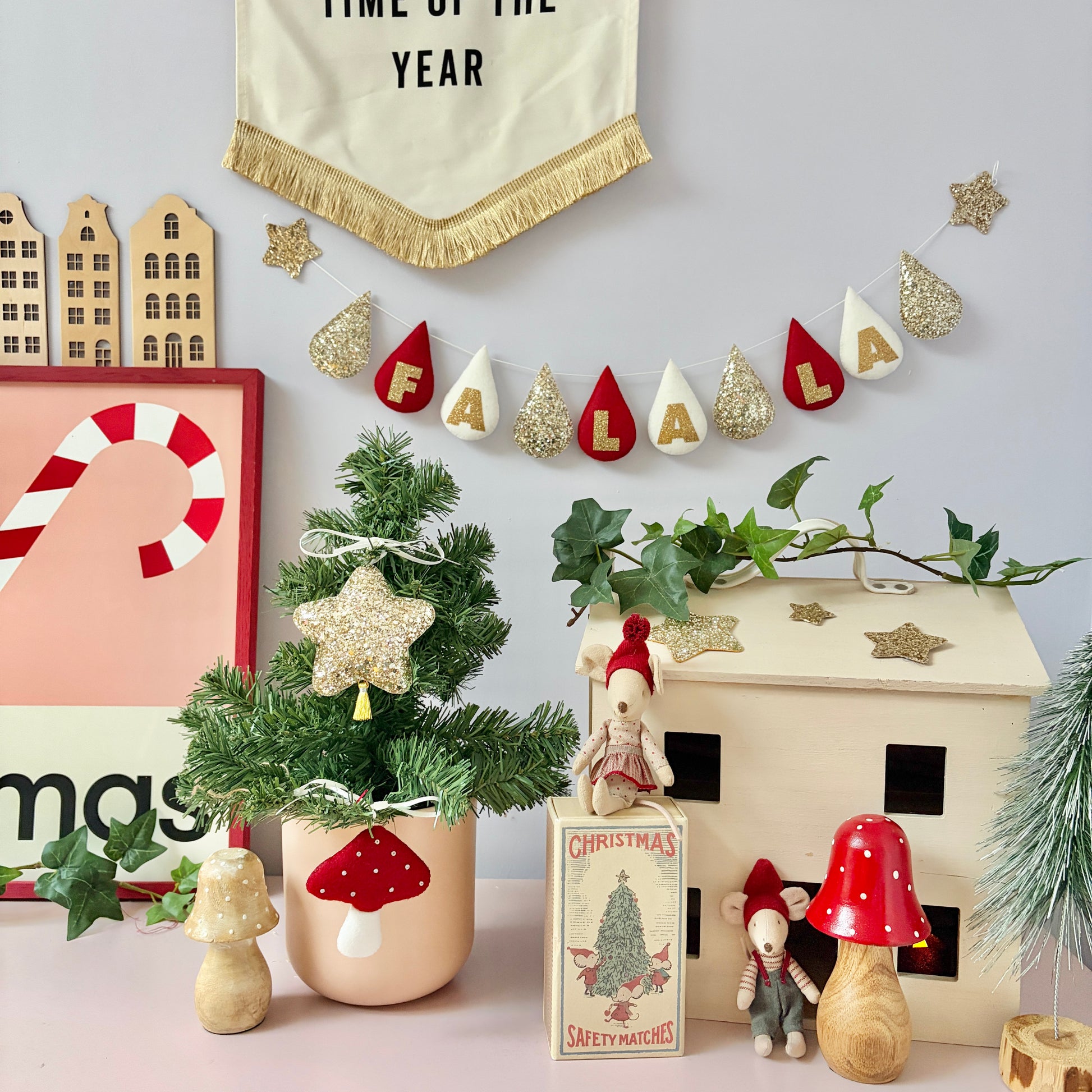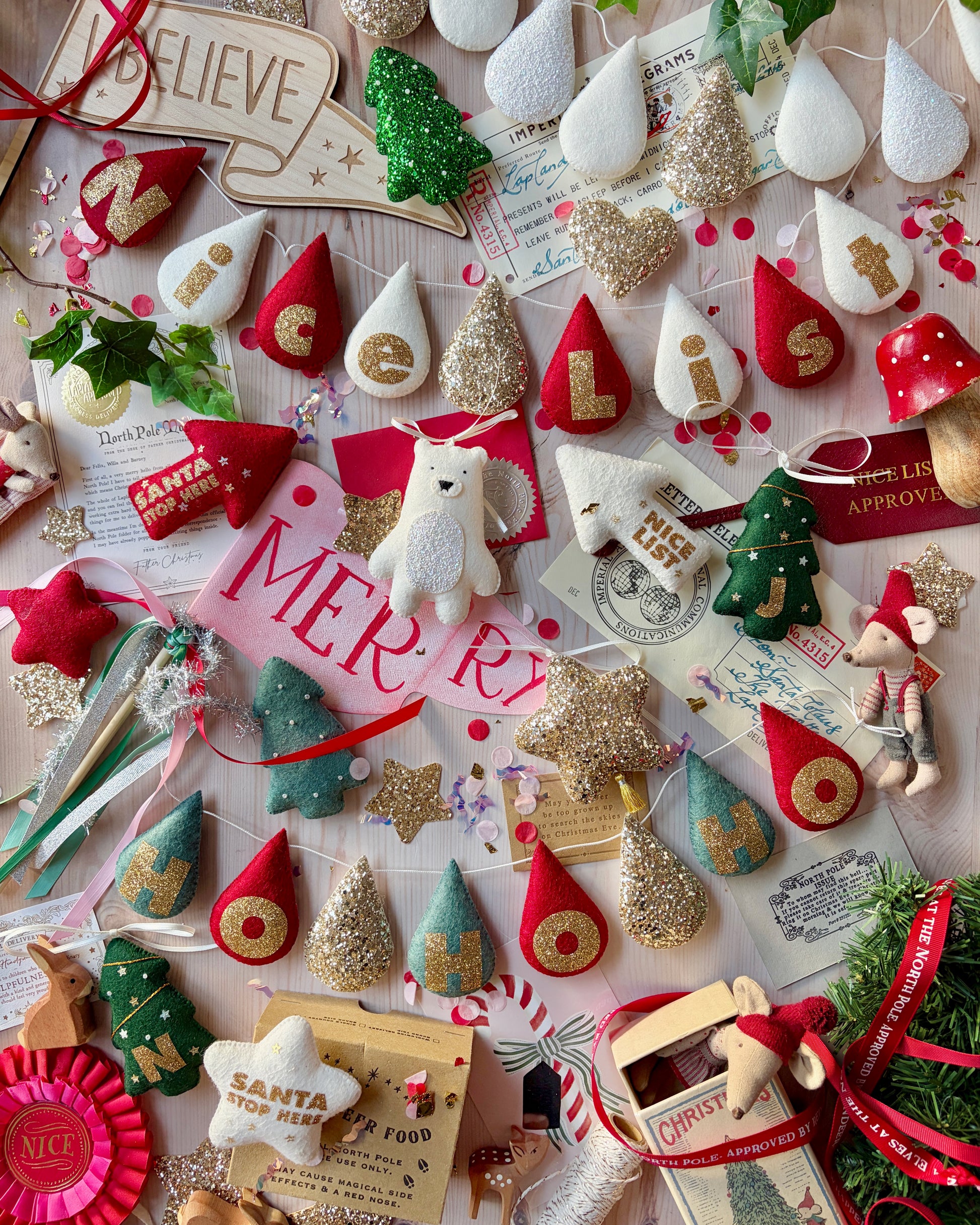 I cannot apply glitter letters to glitter material, so all letters must be on wool felt or Liberty fabric only- I can use glitter drops to add sparkle to each end of a chosen word. Add the 7 drop option for ‘Merry’ with a plain drop at each end for example.