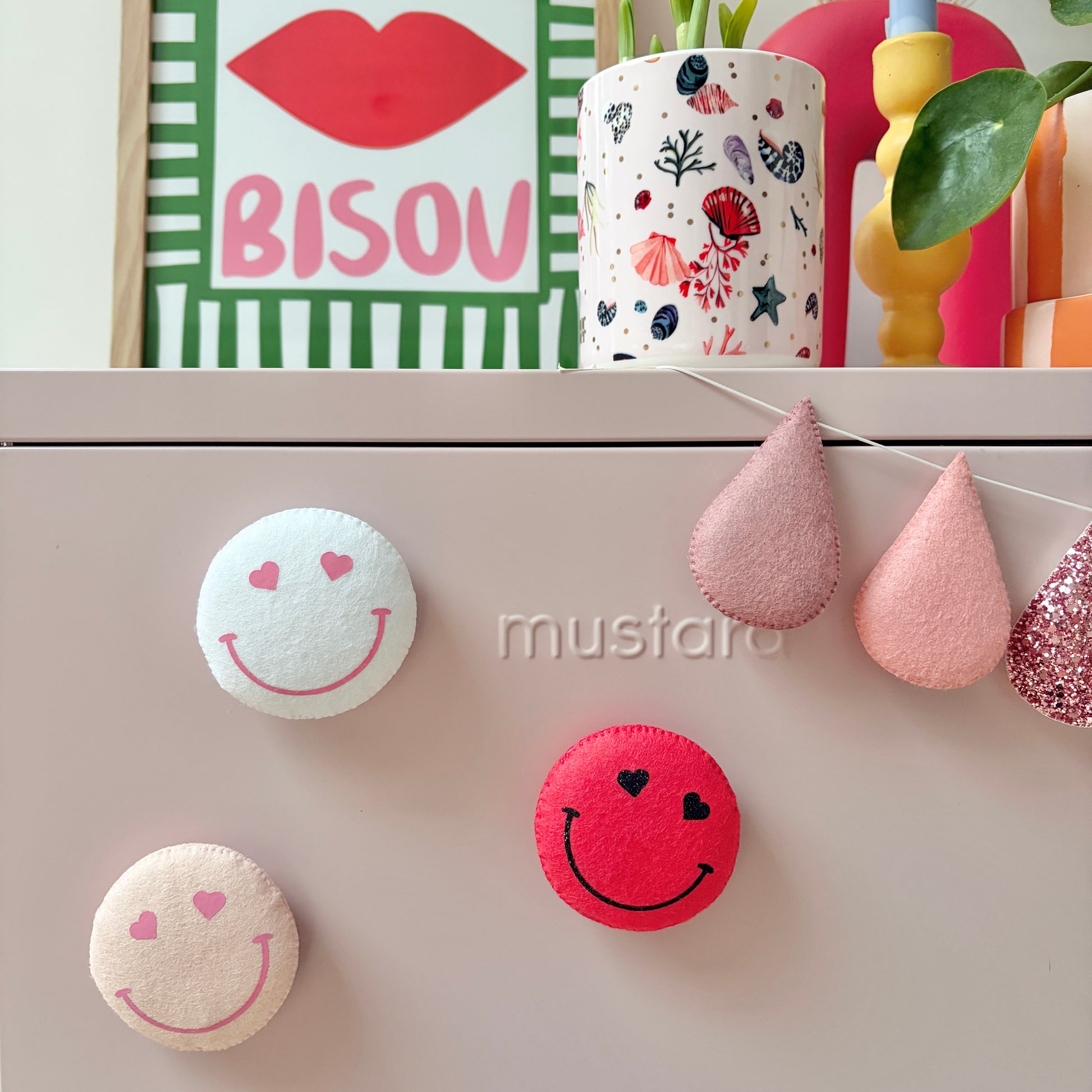 Hand stitched heart eyes smiley face decoration with a hidden magnet on reverse, perfect for decorating lockers and radiators with no damage!