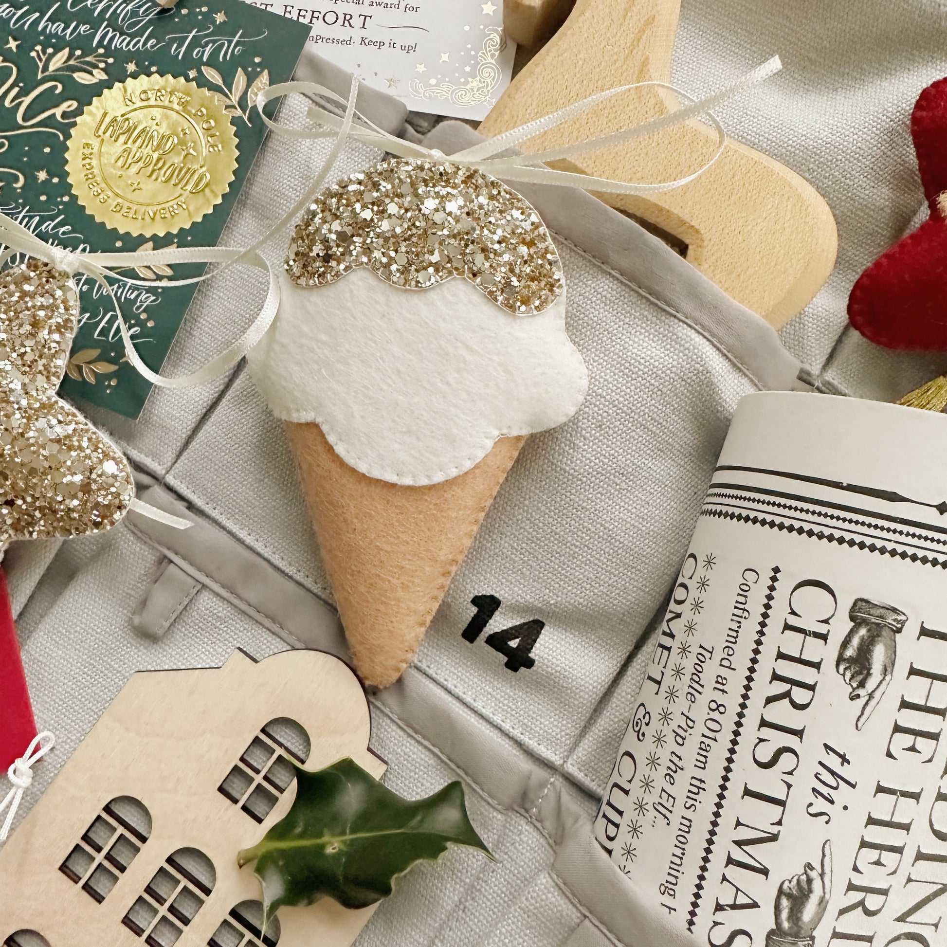 Each ice cream is the same size as the ones found on my garlands and measure 11cm by 7cm for ice creams and 10.5 x 5cm for the lolly style. It is single sided with glitter detail and ‘stick’/ ‘cone’ only visible to the front and is filled with a synthetic stuffing.