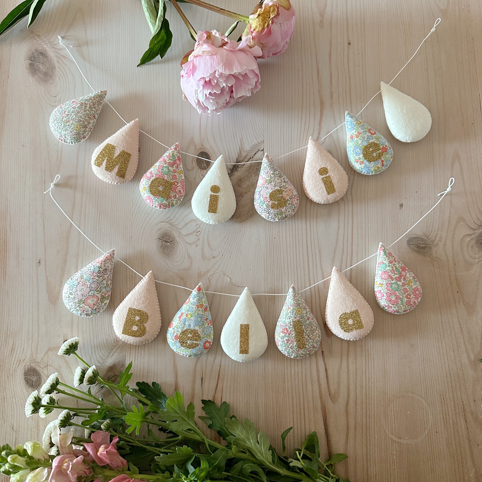 Beautiful handcrafted Custom word/name droplet garland in colours of your choice.