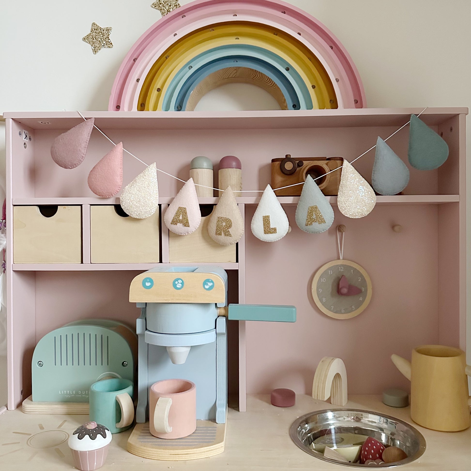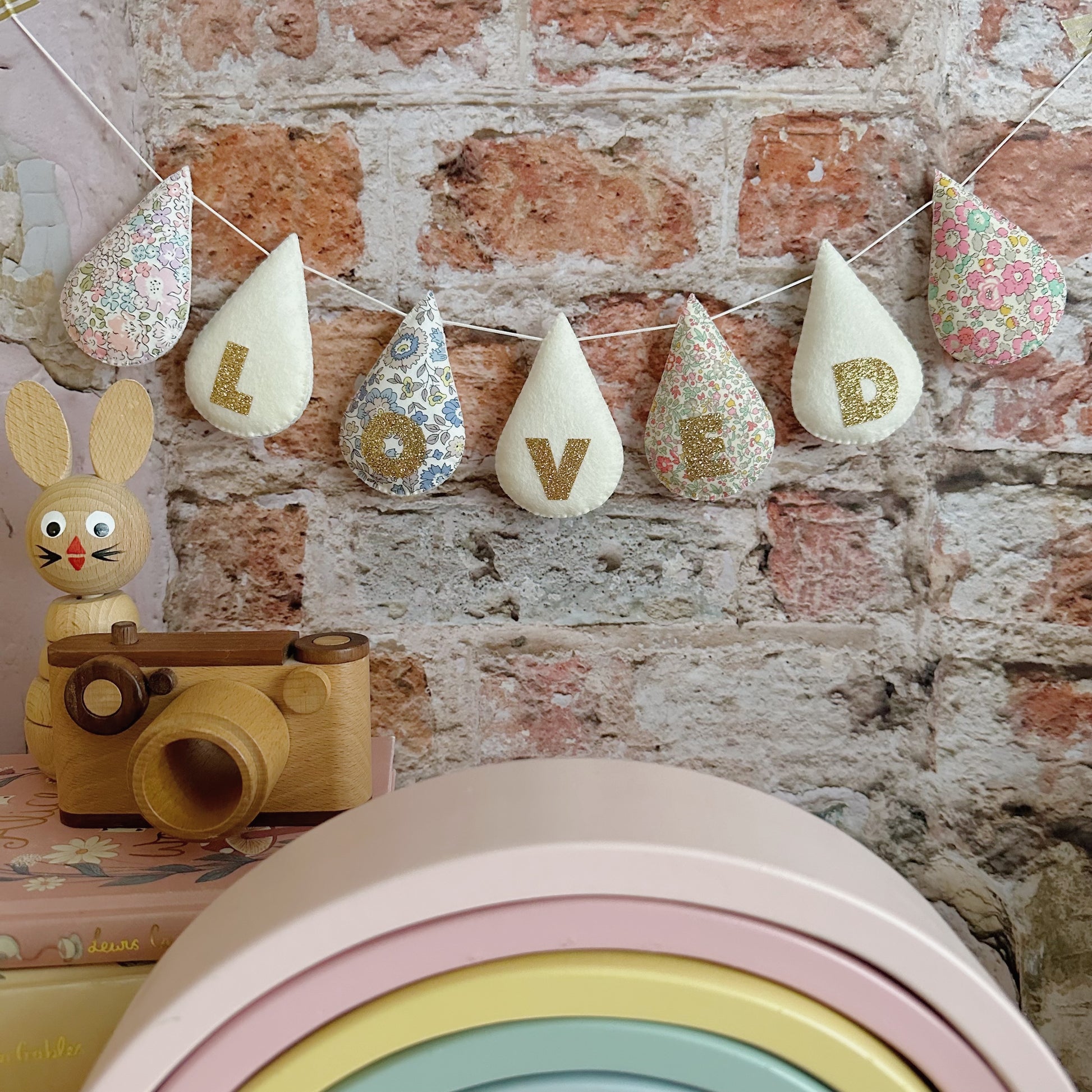 Gold fine glitter lettering (or silver fine glitter) in a word or name of your choice topped onto your your choice of colours. Add extra plain drops, or glitter drops t the ends to create your own bespoke droplet garland which I will create by hand for you.